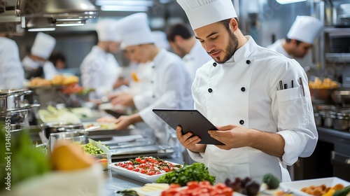 Chef Managing Catering Event with Gantt Chart on Tablet