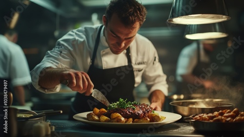 chef plating a delicious steak dish in a professional kitchen
