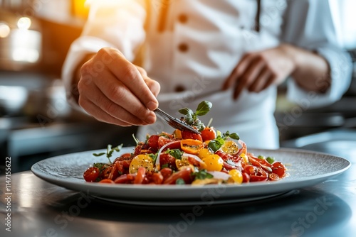 Chef preparing a vibrant tomato salad on a plate in a professional kitchen.