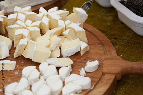 Chef-cook sliced cheese on a cutting board. Cutting ingredients closeup.