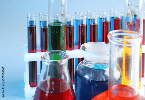 Chemical glassware with different liquids on color background