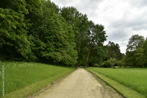 Chemin en graviers beiges vers l'un des bois du Jardin Botanique Nationale de Belgique à Meise