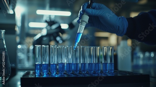 Chemist Carefully Pipetting Blue Solution in Lab