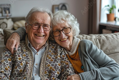 Cherished moments captured: Elderly couple smiling warmly, cozy in their home, exuding love and lifelong companionship.