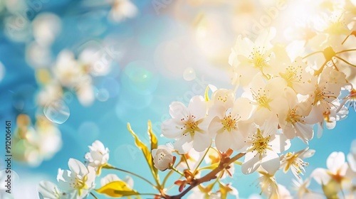 Cherry blossom branch white flowers on sunny blue sky. Springtime flowering beautiful nature landscape which is very beautiful
