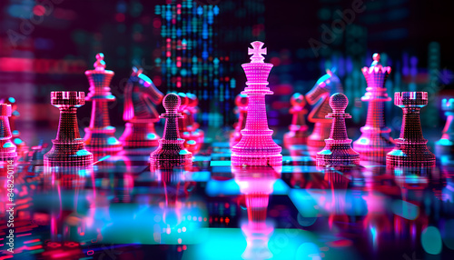 Chess pieces on board in neon lights. Circuit board pattern and binary code symbolizing artificial intelligence