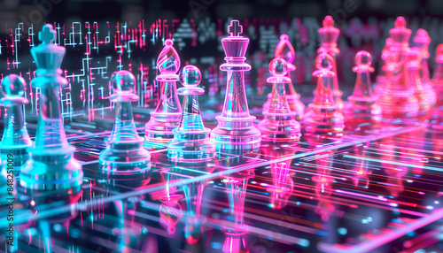 Chess pieces on board in neon lights. Circuit board pattern and binary code symbolizing artificial intelligence