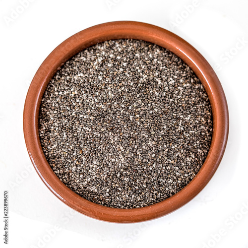 Chia seeds in a ceramic bowl isolated on white background. Closeup. Top view. Chia Super Food. Healthy eating concept