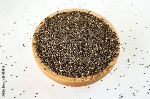 Chia seeds in a wood bowl on white background