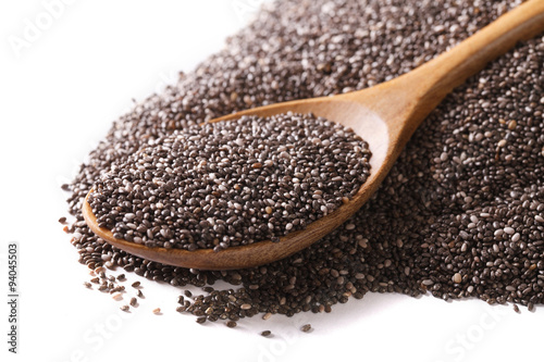 Chia seeds macro in a wooden spoon isolated on a white. Horizontal