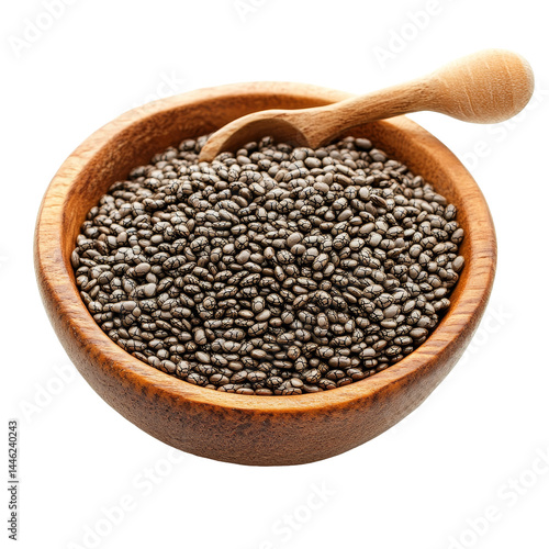 Chia seeds on a transparent background in a wooden bowl with a spoon captured in natural light, Chia seeds isolated