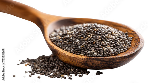Chia Seeds Scoop: A close-up captures the texture and detail of chia seeds, elegantly presented in a wooden spoon. This image captures the essence of healthy eating and mindful consumption.