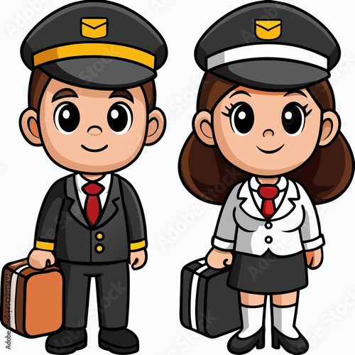 Chibi Airline Pilot Characters Vector – Cute Male & Female Crew in Uniform Sticker Art