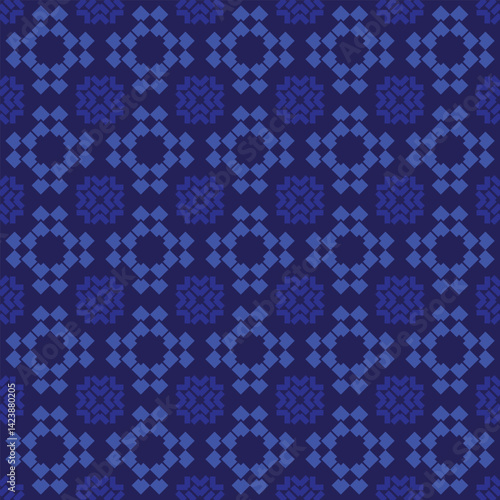 Chic boho pastel pattern with geometric floral ikat motifs in soft to dark blue gradients
