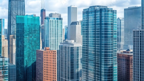 Chicago Skyline Aerial View Modern skyscrapers, city buildings, daytime, cloudy sky, urban development