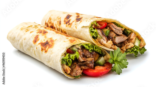 Chicken and Vegetable Burrito Wraps. Delicious chicken shawarma. Turkish fast food doner roll with shawarma and meat and vegetables on a white background. AI generation