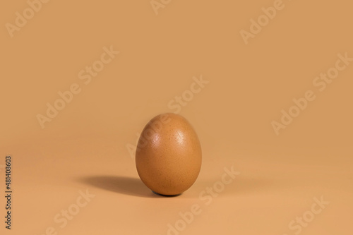 Chicken natural fresh egg is isolated on a beige background. Eco-concept. Vertical photo, postcard.