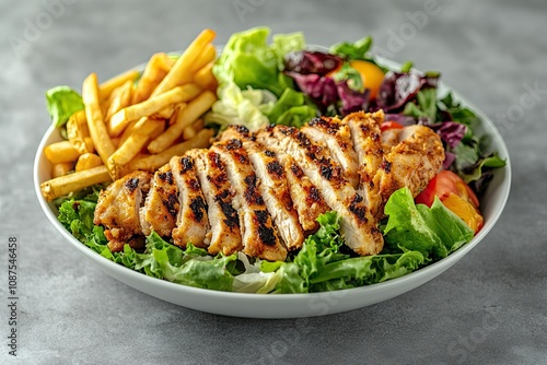 Chicken Shawarma plate with salad, fries served in a dish isolated on grey background side view of arabian fastfood