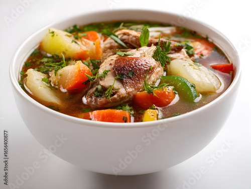 Chicken vegetable soup in a white bowl, a healthy and homemade meal with fresh ingredients and herbs