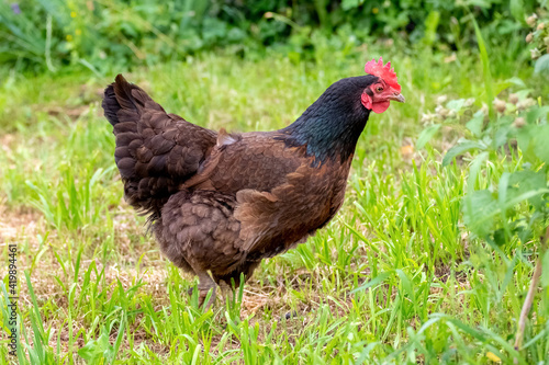 Chicken with black and brown feathers in the garden on the grass