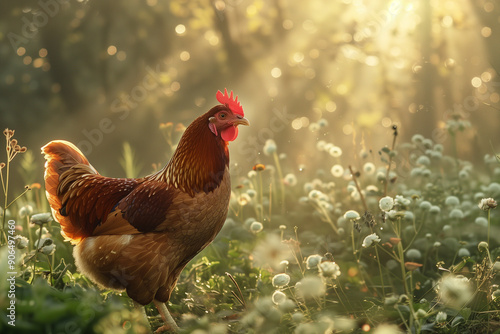 Chickens grazing in the meadow in the sun