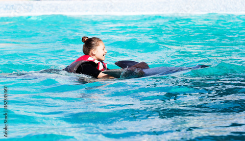 child and a dolphin swim together