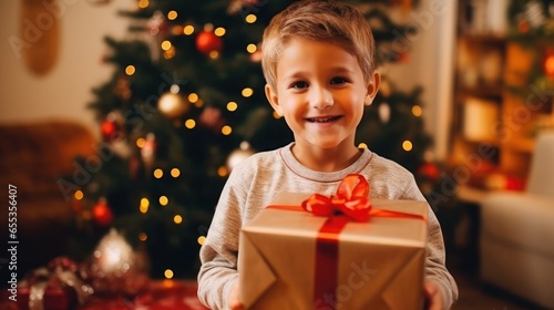 Child at home with Christmas present near the Christmas tree, generative ai