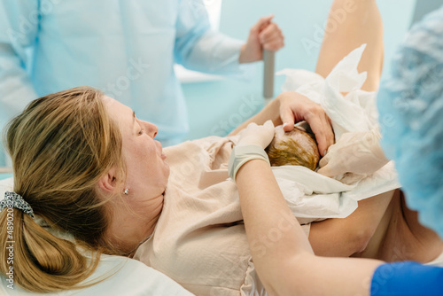 Child birth in maternity hospital. Happy mom with her newborn baby daughter after delivery. Woman giving birth. First moments of baby life after labor.