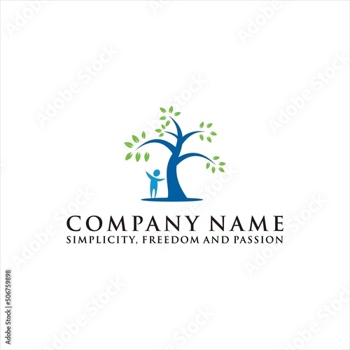 Child Children Logo. Happy Kid and Family Symbol. Green Tree Leaf Design. School Clinic Brand. Natural Growth and Ecology Concept. Support, Love, Freedom Vector Icon. Modern Creative Identity.