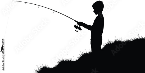 Child fishing silhouette illustration, outdoor play and nature interaction concept artwork for childhood, lifestyle, and recreational design