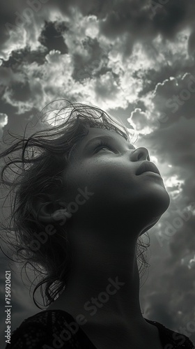 Child girl looking up, moody overcast sky. Emotional storytelling in photography. AI Generated.