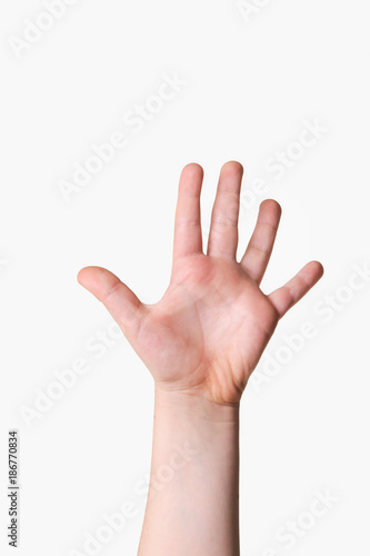 Child hand holding up four fingers on a white background