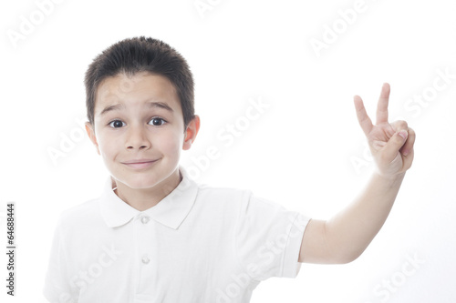 Child showing peace sign.