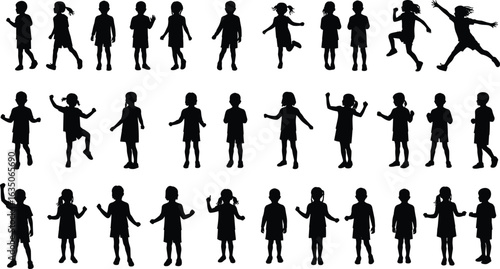 Child silhouette vector set, kids playing illustration, children pose graphic, black flat design, playful activity collection, cad drawing flat vector illustration