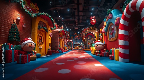 Children?? Christmas play area with bright, colorful decorations, oversized candy canes, and whimsical holiday characters