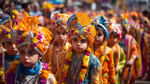 Children Dressed as Krishna for Janmashtami Festival Parade – Colorful Cultural Celebration Capturing Indian Traditions, Devotion, and Festive Spirit in Vibrant Traditional Attire