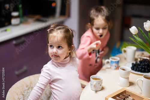 Children eat fruits and desserts, drink tea at home in the evening kitchen.