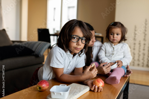 Children eating apples at home