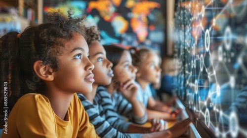 Children engaged with interactive digital display, learning about technology and science in a modern classroom setting.
