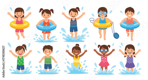 Children enthusiastically jumping into a swimming pool splashing water.