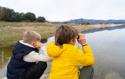 Children looking through binoculars at a lake