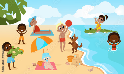 Children relax on the beach, sunbathe, play with a dog, swim on a crocodile water mattress, swim on the water, sit under a sun umbrella. Cartoon illustration of summer vacation and activity.