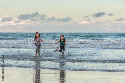 Children running on the beach juggling joy