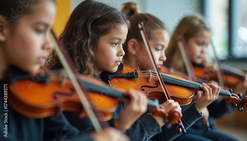 Children with violins focus intently as they practice. Young musicians tune their instruments in a bright classroom preparing for a performance or lesson. Music class education.