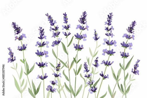 Children's book style whimsical Illustration with flat pastel colors, Contour drawing, outline all shapes, Create a beautiful picture of a Lavender (Lavandula) with slender purple flowers and thin gre