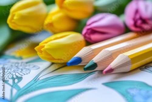 Children's Coloring Book Page with Tulips Pattern, Surrounded by Colored Pencils on Table