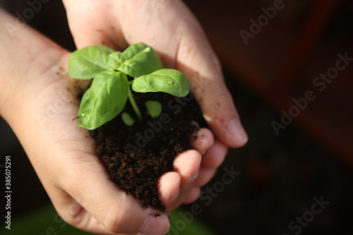 Children's hands are holding a green sprout. Concept photo. hands holding a plant