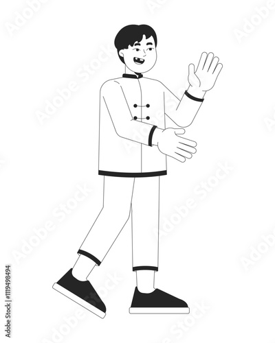 Chinese boy child in traditional tang suit clapping excited black and white 2D line character. Asian cute kid in oriental costume isolated vector outline person. Monochromatic spot illustration
