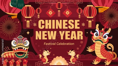 Chinese New Year Background with Golden Dragon and Phoenix on Red Patterned Frame