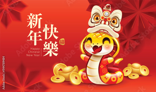 Chinese New Year cute snake on oriental paper graphic flower background. Year of Snake. Translation - Happy New Year.